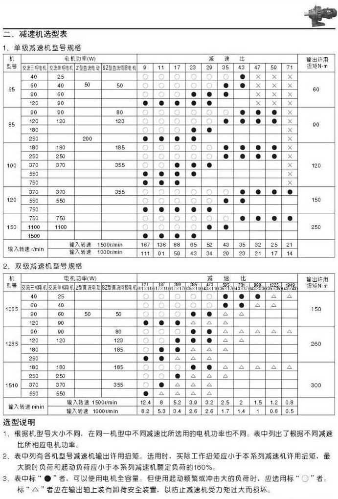 WB系列擺線針輪減速機選型表單級減速機型號規(guī)格表雙級減速機型號規(guī)格表選型說明